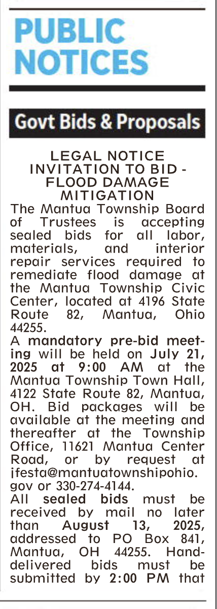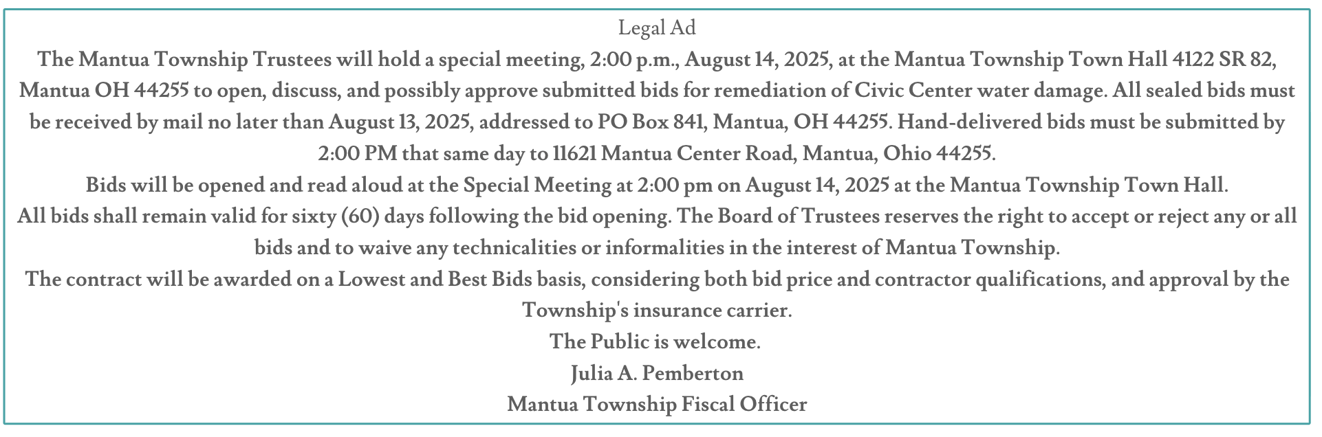 The Mantua Township Trustees will hold a special meeting, 2:00 p.m., August 14, 2025, at the Mantua Township Town Hall 4122 SR 82, Mantua OH 44255 to open, discuss, and possibly approve submitted bids for remediation of Civic Center water damage. All sealed bids must be received by mail no later than August 13, 2025, addressed to PO Box 841, Mantua, OH 44255. Hand-delivered bids must be submitted by 2:00 PM that same day to 11621 Mantua Center Road, Mantua, Ohio 44255.