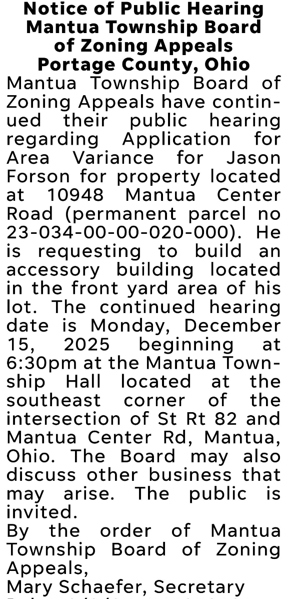 Mantua Township Board of Zoning Appeals have continued their public hearing regarding Application for Area Variance for Jason Forson for property located at 10948 Mantua Center Road (permanent parcel no 23-034-00-00-020-000). He is requesting to build an accessory building located in the front yard area of his lot. The continued hearing date is Monday, December 15, 2025 beginning at 6:30pm at the Mantua Township Hall located at the southeast corner of the intersection of St Rt 82 and Mantua Center Rd, Mantua, Ohio. The Board may also discuss other business that may arise. The public is invited.