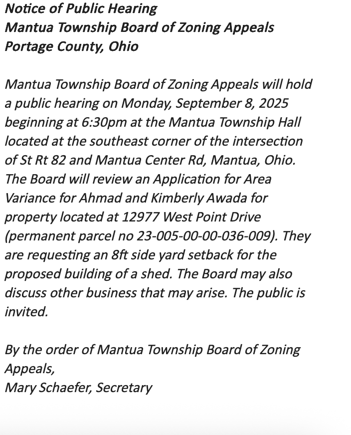 Mantua Township Board of Zoning Appeals will hold a public hearing on Monday, September 8, 2025 beginning at 6:30pm at the Mantua Township Hall located at the southeast corner of the intersection of St Rt 82 and Mantua Center Rd, Mantua, Ohio. The Board will review an Application for Area Variance for Ahmad and Kimberly Awada for property located at 12977 West Point Drive (permanent parcel no 23-005-00-00-036-009). They are requesting an 8ft side yard setback for the proposed building of a shed. The Board may also discuss other business that may arise. The public is invited.